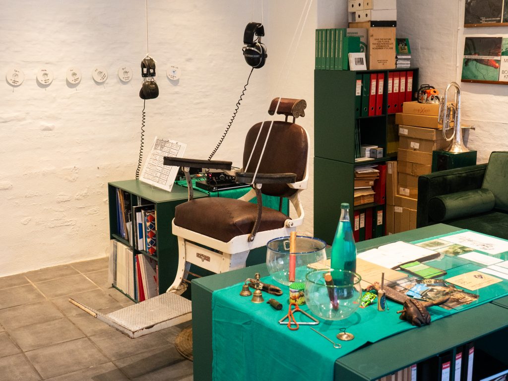 I Arkivet har vi fundet materialer, der kan hjælpe os med at realisere en Øresalon anno 2023. I udstillingsperioden vil barberstolen, objekter, tegninger, grønne øre krukke lyd skulpturer, samt performances og publikationer blive præsenteret.